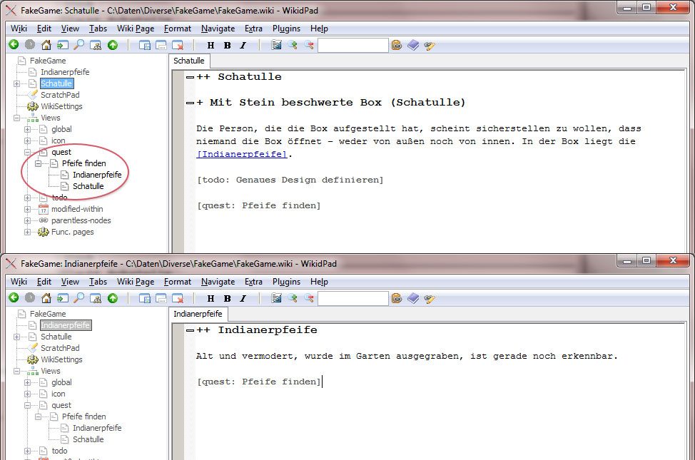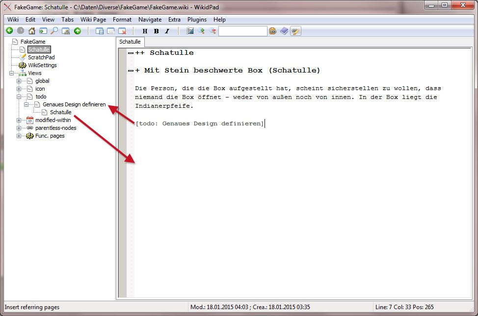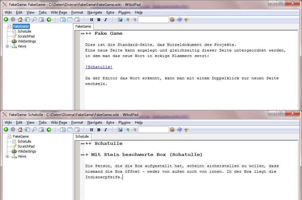 Zu beachten ist, dass Wiki-Seiten nicht alleine stehen können, d.h. sie müssen einer anderen Seite, im einfachsten Fall dem Projekt-Wurzeldokument, untergeordnet werden. Auf diese Weise entsteht ganz automatisch eine Hierarchie, da jedes Dokument ein Elterndokument hat. Ein neues Dokument/Wiki-Wort lässt sich anlegen und unterordnen, in dem in einem beliebigen anderen Dokument ein Link der Form [neuesWort] angelegt wird. Der WikidPad-Editor formatiert diesen Link, so dass bereits innerhalb des Editors per Doppelklick auf das Wort zu diesem navigiert werden kann. Die Abbildung rechts zeigt die Beschreibung des InGame-Objekts „Schatulle“, das als neues Wort der Wurzelseite hinzugefügt wurde. Im Navigationsbaum links wird die Hierarchie sofort abgebildet.