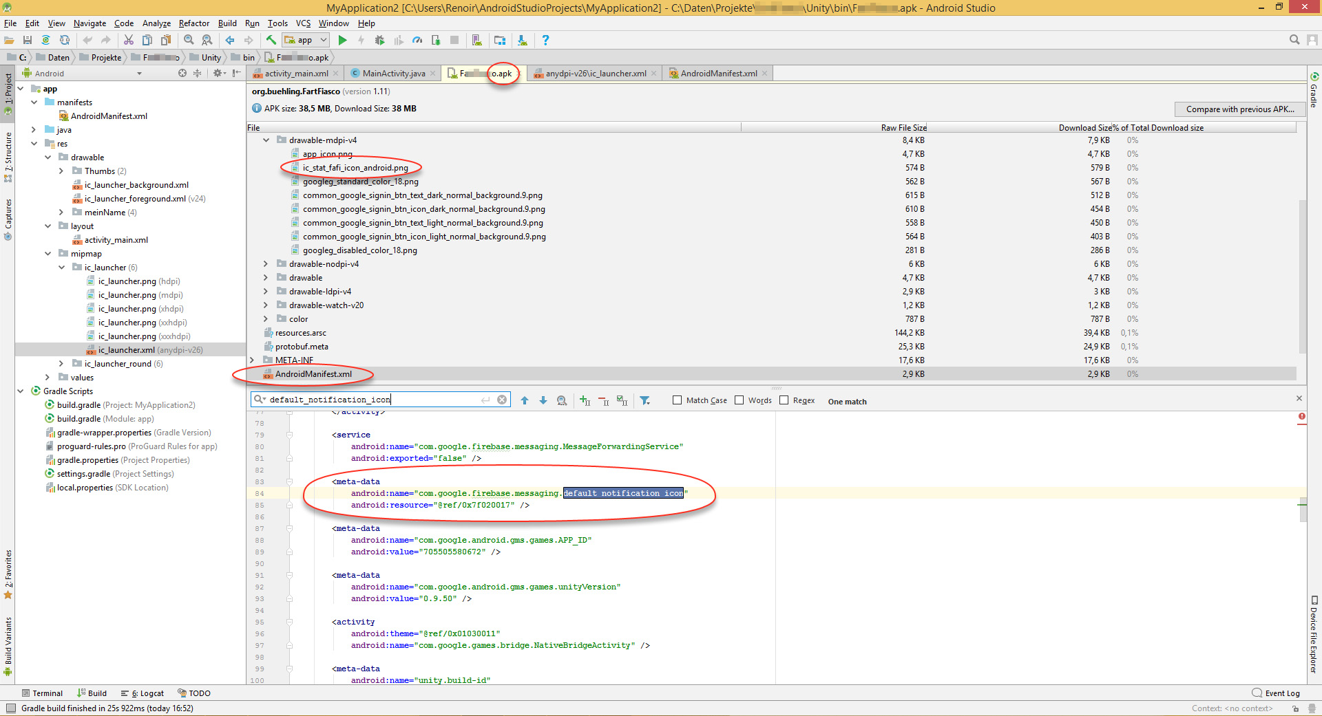 Um das Standard-Symbol für Firebase Push-Notifications in einem Unity-Projekt für Android zu setzen, müssen die Bilddateien unterhalb von Assets/Plugins/Android/res liegen. Ergänzungen des XML-Manifests lassen sich in der Datei Assets/Plugins/Android/AndroidManifest.xml hinterlegen, die der Gradle-Build mit der automatisch erzeugten Manifestdatei zusammenführt.